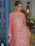 Twirl in style sporting this pink color straight cut readymade kameez made in chinon silk. Designed using sequins and zari work with floral thread embellishment all over. Available with a matching pink color palazzo style bottom and a pink color dupatta, both made in chinon silk. Note: Accessories shown are for styling purpose only. Slight color variation may occur due to photographic reasons.