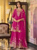 Effortlessly slay the day as you wear this rani pink color flare style readymade kameez made in chinon silk. Furnished using sequins and floral zari work embellishment all over. Available with a matching pink color palazzo style bottom and a pink color dupatta, both made in chinon silk. Note: Accessories shown are for styling purpose only. Slight color variation may occur due to photographic reasons.