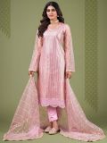 Overwhelm the onlookers adorning this baby pink color straight cut kameez in net. Elevated using sequins and thread work embroidery all over. Comes with an embroidered net dupatta and matching pants in shantoon. Note: Accessories shown are for styling purpose only. Slight color variation may occur due to photographic reasons. The semi-stitched kameez can be customised upto 42 inches.