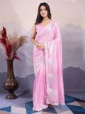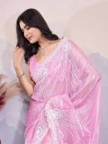 Give a glamorous glance wearing this pink color saree crafted in net. Furnished using sequins and zari embroidered patterns all over. Comes with a matching pink color blouse in net. Note: The accessories featured are purely for fashion purposes. Due to photography reasons, some color variations may occur. The un-stitched blouse may be customized up to 42 inches.