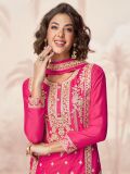 Invigorate your wardrobe by adding this pink color full sleeved straight cut long kameez made in chinon silk. Augmented using sequins and floral zari work all over. Comes with a matching pink color palazzo style bottom and a pink color dupatta, both made in chinon silk. Note: Accessories shown are for styling purpose only. Slight color variation may occur due to photographic reasons. The semi-stitched kameez can be customised upto 42 inches.