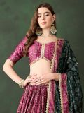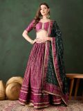 Look no less than a dream wearing this rani pink color designer lehenga made in poly satin. Designed with floral print and bandhej printed pattern all over with lace. Available with a matching pink color printed choli in poly satin and a dark green color bandhej printed dupatta, made in gaji silk. Note: The accessories featured are purely for fashion purposes. Due to photography reasons, some color variations may occur. The semi-stitched choli and lehenga waist may be customized up to 42 inches.