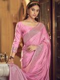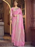 Allure the crowd as you wear this lush pink color saree crafted in art silk. Designed using woven patterns all over, showcasing distinstive borders and pallu. Comes with a matching pink color blouse in art silk. Note: The accessories featured are purely for fashion purposes. Due to photography reasons, some color variations may occur. The un-stitched blouse may be customized up to 42 inches.