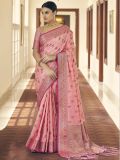 Get a soft traditional look with this soft pink color saree crafted in tusssar silk. Designed using zari woven patterns, showcasing distinstive borders and pallu with threaded tassels. Comes with a matching pink color blouse in tussar silk. Note: The accessories featured are purely for fashion purposes. Due to photography reasons, some color variations may occur. The un-stitched blouse may be customized up to 42 inches.