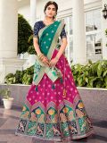 Take a peek at this deep pink color lehenga in banarasi silk. Decorated with traditional zari woven patterns. Teamed with blue color banarasi silk choli and sea green dupatta with similar weaves. Note: The accessories featured are purely for fashion purposes. Due to photography reasons, some color variations may occur. The semi-stitched choli and lehenga waist may be customized up to 42 inches.