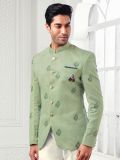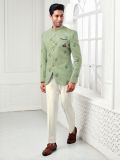 Royal affair unfold as the groom steps into this Jodhpuri suit, designed for the modern man who values tradition with a contemporary twist. This suit features a bandhgala jacket designed in pista green color adorned with intricate embroidery. The suit is crafted from premium fabric with a luxurious sheen, ensuring comfort and style for any occasion, from weddings to formal events. Paired with fitted trouser/pant, made in white color perfect for making a lasting impression. Elevate your wardrobe with this Jodhpuri suit that captures the essence of heritage.Note: Some color variations may occur owing to photography causes. Up to 1 inch of measurement fluctuation is possible.