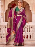 Show your traditional side adorning this heart purple color saree crafted in banarasi silk. Elevated using zari woven jacquard patterns, showcasing distinstive borders and pallu. Comes with a contrast matching green color blouse in banarasi silk. Note: The accessories featured are purely for fashion purposes. Due to photography reasons, some color variations may occur. The un-stitched blouse may be customized up to 42 inches.