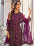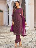 Grace up sweetly adorning this royal purple color straight cut kameez made in net. Crafted using dori embroidery all over. Assembled with a matching net dupatta and a matching palazzo in net with satin liner. Note: Accessories shown are for styling purpose only. Slight color variation may occur due to photographic reasons. The semi-stitched kameez can be customised upto 42 inches.