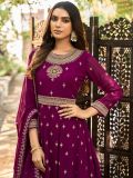 Look vibrant and stylish adorning this grape purple color anarkali kameez in georgette. Enhanced using zari and dori work embroidery with sequins all over. Paired with a matching georgette dupatta and a matching bottom in shantoon with linings. Note: Accessories shown are for styling purpose only. Slight color variation may occur due to photographic reasons. The semi-stitched kameez can be customised upto 42 inches.