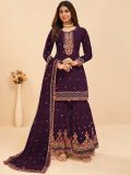 Look all royal and fancy sporting this deep purple color straight cut kameez in georgette. Decked using sequins, thread and mirror work embroidery all over. Paired with a matching georgette dupatta and a matching embroidered sharara in georgette. Note: Accessories shown are for styling purpose only. Slight color variation may occur due to photographic reasons. The semi-stitched kameez can be customised upto 42 inches.