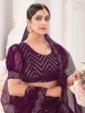 Get a praiseworthy look wearing this wine purple color designer lehenga in net. Designed with sequins and thread embroidered work. Paired with a matching purple color embroidered choli and purple dupatta, both made in net. Note: The accessories featured are purely for fashion purposes. Due to photography reasons, some color variations may occur. The semi-stitched choli and lehenga waist may be customized up to 42 inches.