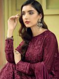 Look elegant adorning this wine purple straight cut kameez in georgette. Decoarated using sequins and thread embroidery all over. Available with a matching chiffon dupatta and a pants in shantoon. Note: Accessories shown are for styling purpose only. Slight color variation may occur due to photographic reasons. The semi-stitched kameez can be customised upto 42 inches.