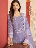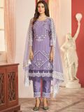 Exude major dreamy vibes sporting this lilac purple color straight cut kameez in georgette. Enhanced using sequins and thread work embroidery with cutdana work all over. Comes with a matching net dupatta and matching pants in shantoon. Note: Accessories shown are for styling purpose only. Slight color variation may occur due to photographic reasons. The semi-stitched kameez can be customised upto 42 inches.