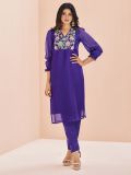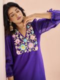 Walk the glam wearing this purple color fluffy sleeved readymade kurti made in organza. Augmented using hand work. Paired with matching purple color pant style bottom in organza. Note: Some color variations may occur owing to photography causes. Up to 1 inch of measurement fluctuation is possible.