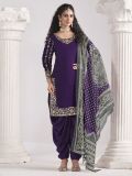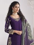 Glam up sweetly wearing this royal purple color straight cut kameez made in roman silk. Crafted using sequins and mirror work embellishment with floral zari embroidery all over over. Paired with a matching purple color punjabi style bottom in santoon fabric and a purple color bandhani printed dupatta made in chanderi silk. Note: Accessories shown are for styling purpose only. Slight color variation may occur due to photographic reasons. The semi-stitched kameez can be customised upto 42 inches.