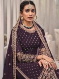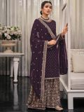 Exhibiting this grape purple color kameez in georgette. Decorated using thread and sequins embroidery all over. Comes with an embroidered georgette dupatta and a matching sharara in georgette. Note: Accessories shown are for styling purpose only. Slight color variation may occur due to photographic reasons. The semi-stitched kameez can be customised upto 42 inches.