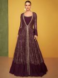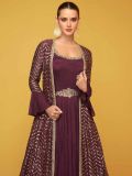 Stand out from the crowd adorning this grape purple color jacket style anarkali kameez in georgette. Designed using zari, stones and embroidery all over. Paired with a matching chiffon dupatta and a matching bottom in georgette. Note: Accessories shown are for styling purpose only. Slight color variation may occur due to photographic reasons. The semi-stitched kameez can be customised upto 42 inches.