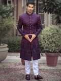 Grab all the compliments adorning this heart purple color indo western sherwani made in art silk. Designed using detailed thread embroidery with foil mirror like work. Crafted using mandarin collar, buttoned up front and full sleeves. Teamed with a white color pants in art silk. Do note slight color variation may occur due to photographic reasons. Measurement variation up to 1 inch is possible.