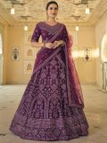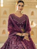 Steal the limelight wearing this grape purple designer lehenga in net. Enhanced with mirror work, stones and dori embroidered work. Teamed with a matching purple color choli and a purple embroidered dupatta, both crafted in net. Please Note: The accessories featured are purely for fashion purposes. Due to photography reasons, some color variations may occur. The semi-stitched choli and lehenga waist may be customized up to 42 inches.