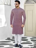 Spread cheer adorning this heart purple color full sleeved kurta made in jacquard. Designed with dense printed details. Assembled with white color trousers in silk. Note: Some color variations may occur owing to photography causes. Up to 1 inch of measurement fluctuation is possible.