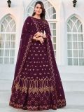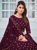 Get set to look regal adorning this wine purple color lehenga in georgette. Spruced with sequins and thread embroidered work. Comes with a matching purple color embroidered choli and purple dupatta, both made in georgette. Note: The accessories featured are purely for fashion purposes. Due to photography reasons, some color variations may occur. The semi-stitched choli and lehenga waist may be customized up to 42 inches.