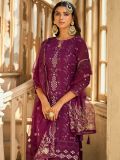 Showcasing this grape purple color straight cut kameez in georgette. Designed using sequins and thread embroidery all over. Paired with an embroidered net dupatta and a matching bottom in shantoon. Note: Accessories shown are for styling purpose only. Slight color variation may occur due to photographic reasons. The semi-stitched kameez can be customised upto 42 inches.