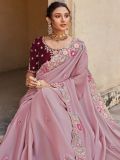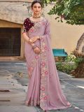 Look royally stunning adorning this light purple color saree crafted in silk. Enhanced using sequins, thread and zari embroidered patterns with stones, displaying distinstive borders. Assembled with an embroidered deep maroon color blouse in silk. Note: The accessories featured are purely for fashion purposes. Due to photography reasons, some color variations may occur. The un-stitched blouse may be customized up to 42 inches.