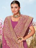 Invigorate your wardrobe by adding this light purple color saree crafted in georgette. Enhanced using zari woven patterns, displaying unique borders and pallu. Comes with a matching purple color zari woven blouse in georgette. Note: The accessories featured are purely for fashion purposes. Due to photography reasons, some color variations may occur. The un-stitched blouse may be customized up to 42 inches.