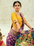 Effortlessly slay the day as you wear this dark purple color bridal saree designed in pure georgette. Furnished using sequins, stone work and floral thread work enhanced, mirror work embellishment or heavy zari embroidery with floral and bandhej printed patterns, showcasing distinstive heavy embroidered borders and woven pallu with tassels. Available with a yellow color embroidered blouse in silk. Note: The accessories featured are purely for fashion purposes. Due to photography reasons, some color variations may occur. The un-stitched blouse may be customized up to 42 inches.