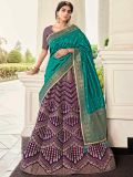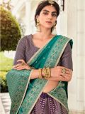 Reveal your feminine side adorning this purple color lehenga in banarasi silk. Furnished with traditional zari woven patterns. Comes with matching purple color banarasi silk choli and turquoise dupatta with similar weaves. Note: The accessories featured are purely for fashion purposes. Due to photography reasons, some color variations may occur. The semi-stitched choli and lehenga waist may be customized up to 42 inches.