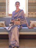 Overwhelm the audience adorning this purple color party wear saree made in handloom silk. Decorated using zari woven patterns all over and a pallu styled with thread tassels. Comes with a matching purple color blouse in silk. Please keep in mind that the accessories featured are purely for fashion purposes. Due to photography reasons, some color variations may occur. The un-stitched blouse may be customized up to 42 inches.