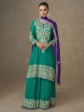 Show your feminine side to the world wearing this rama green color full sleeved anarkali suit readymade kameez crafted in chinon silk. Enhanced using sequins and mirror work embellishment with floral zari embroidery all over. Comes with a matching green color palazzo style bottom and a royal purple color dupatta, both made in chinon silk. Note: Accessories shown are for styling purpose only. Slight color variation may occur due to photographic reasons.
