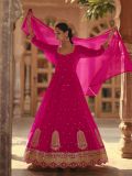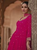 Reflect your glamour personality wearing with this rani pink color anarkali style kameez in net. Augmented using sequins and zari work embroidery all over. Assigned with a georgette dupatta in pink color and a pant style bottom. Note: Accessories shown are for styling purpose only. Slight color variation may occur due to photographic reasons. The semi-stitched kameez can be customised upto 42 inches.
