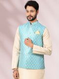 Look dapper adorning this cream color kurta made in art silk. Elevated using a blue color nehru jacket in banarsi silk ehanced with woven details all over. Paired with matching cream color churidar pants in art silk. Note: Some color variations may occur owing to photography causes. Up to 1 inch of measurement fluctuation is possible.