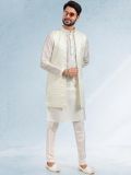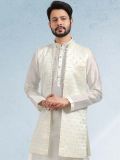Get a squeaky clean look adorning this white color men's kurta made in art silk. Styled with a jacket enriched with thread embroidery with sequins embellishment work. Comes with a matching white color churidaar in art silk. Note: Some color variations may occur owing to photography causes. Up to 1 inch of measurement fluctuation is possible.