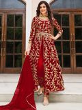 Adorn yourself with love in this crimson red color slitted anarkali kameez in net. Augmented using zari and dori embroidery all over. Comes with a matching net dupatta and an embroidered pant in satin. Note: Accessories shown are for styling purpose only. Slight color variation may occur due to photographic reasons. The semi-stitched kameez can be customised upto 42 inches.