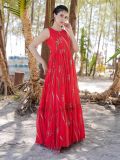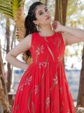 Glam up the views with this red color cut sleeved gown made in georgette. Decorated with digital printed pattern all over. Note: Some color variations may occur owing to photography causes. Up to 1 inch of measurement fluctuation is possible.