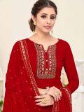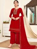 Slay with your style as you wear this red straight cut kameez in georgette. Enhanced using sequins, dori and thread embroidery all over. Assembled with an embroidered georgette dupatta and a palazzo in shantoon. Note: Accessories shown are for styling purpose only. Slight color variation may occur due to photographic reasons. The semi-stitched kameez can be customised upto 42 inches.