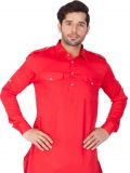 Upgrade your ethnic wardrobe adorning this bright red color kurta made in cotton. Designed with coller pattern and patch pockets. Comes with a red color pathani salwar in cotton. Note: Some color variations may occur owing to photography causes. Up to 1 inch of measurement fluctuation is possible.