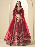 Reflect your glamour personality wearing with this red color bridesmaid lehenga craftedn ics velvet. Designed with sequins work embellishment and heavy zari embroidered work all over. Available with a matching red color embroidered choli in ics velvet and a red color dupatta, made in net. Note: The accessories featured are purely for fashion purposes. Due to photography reasons, some color variations may occur. The semi-stitched choli and lehenga waist may be customized up to 42 inches.