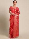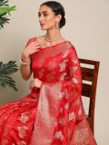 Look elegant adorning this tart red color saree crafted in organza. Crafted using woven patterns, showcasing distinstive borders and pallu. Comes with a matching red color blouse in organza. Note: The accessories featured are purely for fashion purposes. Due to photography reasons, some color variations may occur. The un-stitched blouse may be customized up to 42 inches.