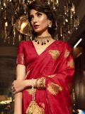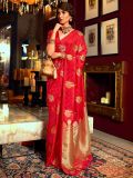 Make a stately statement donning in this red color festive saree crafted in satin. Elevated with zari woven jacquard patterns all over, showcasing distinstive pallu with thread tassels. Comes with a matching red color blouse in satin. Please keep in mind that the accessories featured are purely for fashion purposes. Due to photography reasons, some color variations may occur. The un-stitched blouse may be customized up to 42 inches.