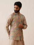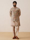 Invigorate your wardrobe by adding this rosegold beige color kurta pyjama with jacket. Augmented using printed pattern in traditional pattern. Paired with the inside kurta and front open jacket features a banded collar and a welted pocket or a pant in matching beige color. Note: Some color variations may occur owing to photography causes. Up to 1 inch of measurement fluctuation is possible.