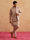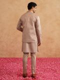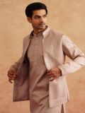 Be the best dressed diva adorning this rosegold beige color kurta made in silk. Crafted using sequins with floral thread embellishment all over. Comes with a beige color pant in art silk and a beige color upper jacket with cut sleeeves made in silk. Note: Some color variations may occur owing to photography causes. Up to 1 inch of measurement fluctuation is possible.