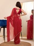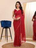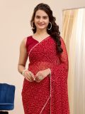 Beat the heat in style with this red color readymade saree crafted in georgette. Designed using digital printed in bandhej pattern. Comes with a matching red color blouse in georgette. Note: The accessories featured are purely for fashion purposes. Due to photography reasons, some color variations may occur. The un-stitched blouse may be customized up to 42 inches.