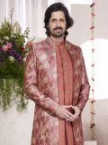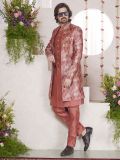 Keep shinning bright adorning this rust color indowestern made in silk. Enhanced using digital printed parttern and sequins work with thread embroidery all over. Paired with a matching rust color full sleeves jacket and a rust color pant both, made in dupion art silk. Note: Some color variations may occur owing to photography causes. Up to 1 inch of measurement fluctuation is possible.