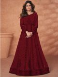 Make a statement adorning this maroon color anarkali kameez in georgette. Augmented using sequins and thread embroidery all over. Comes with a matching dupatta and bottom in georgette. Note: Accessories shown are for styling purpose only. Slight color variation may occur due to photographic reasons. The semi-stitched kameez can be customised upto 42 inches.