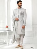 Brighten up your surroundings wearing this silver color sherwani made in art silk. Decorated using thread embroidery with stones embellishment work. Comes with white color churidaar in dupion silk and a matching embroidered stole. Note: Some color variations may occur owing to photography causes. Up to 1 inch of measurement fluctuation is possible.