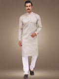 Get a squeaky clean look wearing this silver color kurta made in silk. Finished with mandarin collar, buttoned placket and full sleeves. Comes with white color churidaar in cotton. Note: Some color variations may occur owing to photography causes. Up to 1 inch of measurement fluctuation is possible.
