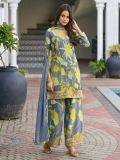 Renew your style statement adorning with this stone blue color straight cut kameez made in chinon silk. Augmented using sequins and zari work embellishment with digital printed pattern all over. Comes with a matching blue color printed palazzo style bottom and a blue color dupatta, both made in chinon silk. Note: Accessories shown are for styling purpose only. Slight color variation may occur due to photographic reasons. The semi-stitched kameez can be customised upto 42 inches.